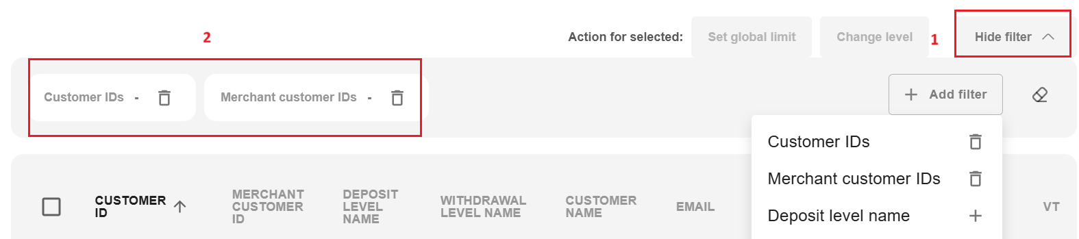 As shown on the image above, press 1 - Show filter to open additional criterion for search. In popp up screen select next criterion: (Payment Gateway’s) Customer IDs, Merchant Customer IDs, Deposit level name, Withdrawal level name, Email or Date range (creation dates).